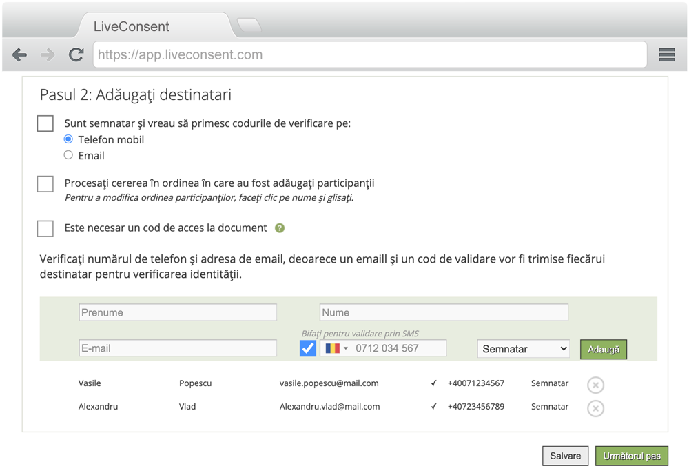 Completați informațiile referitoare la destinatari. Destinatarii pot fi semnatari (acele persoane a căror semnătură este necesară) sau simpli observatori (acele persoane care pot consulta documentul fără a semna).